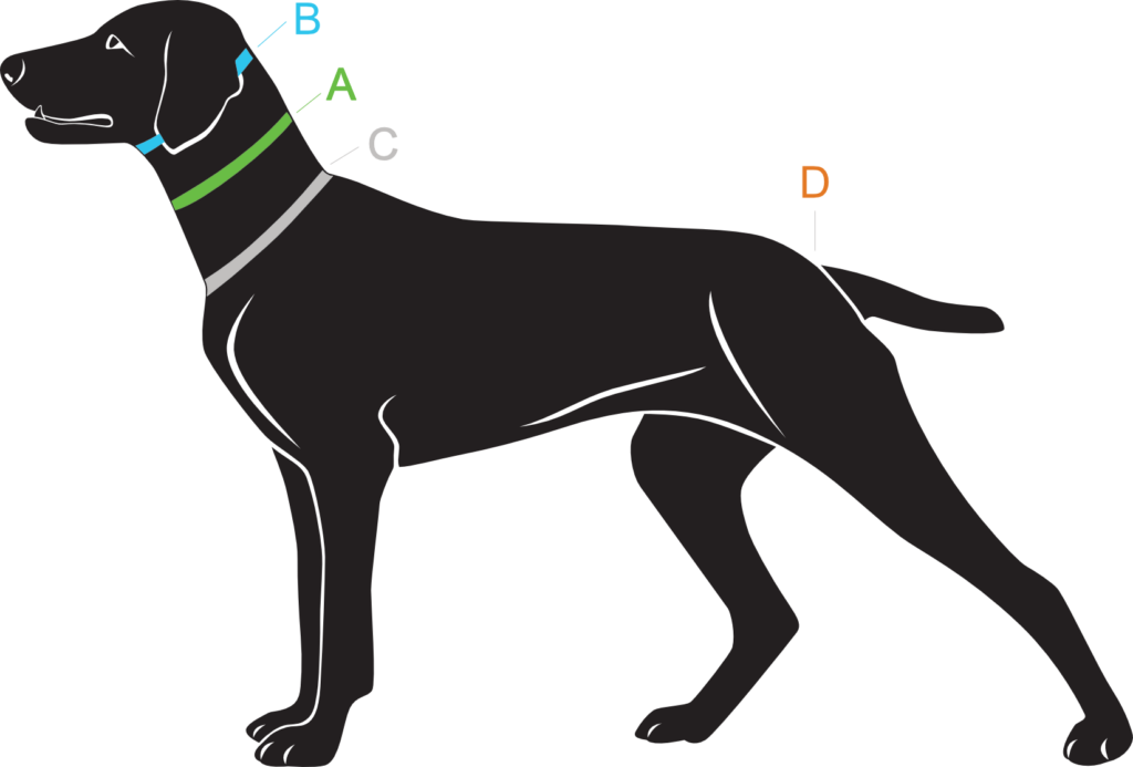 Meet de omtrek boven aan de nek, onder de kop (punt B). Dit is het dunste deel van de hals. Zo voorkomt u dat de dichte half-check over de kop van uw hond kan glijden.