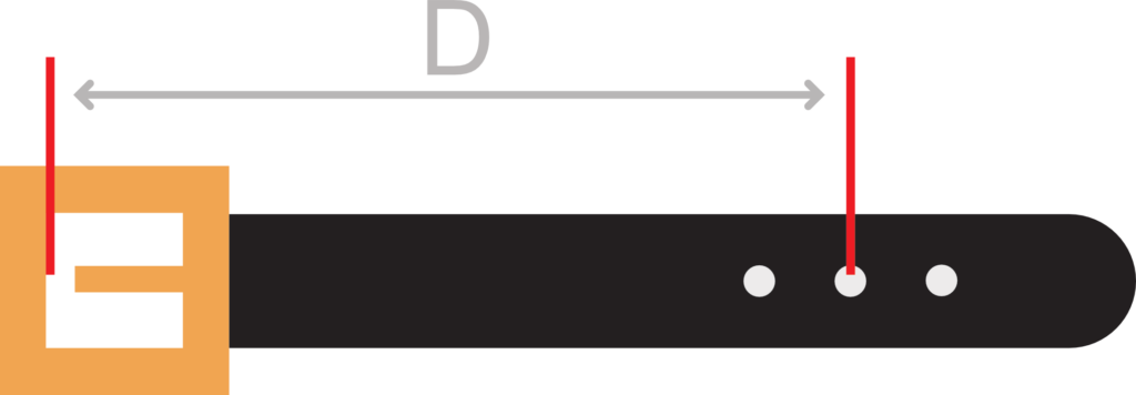 Meet de afstand tussen de gesp en het gaatje dat u gebruikt (D). Dit is de nekmaat.